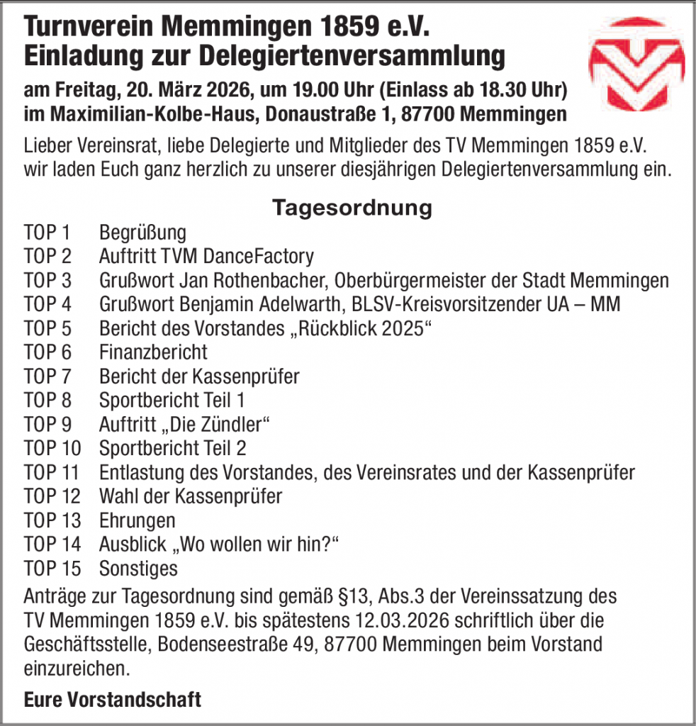 hiermit laden wir euch ganz herzlich ein zur diesjährigen Delegiertenversammlung des Turnverein Memmingen 1859 e.V.
